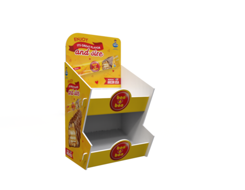 Counter top con cubierta acrílica, 3 bandejas termoformadas con sistema de dispensado trasero, header y cenefas impresas full color con protección UV para colocar precio